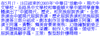 2003 Missouri Botanical Garden Chinese Culture Days Chinese Modern, Historical and Ethic Group Fashion Show (Photo Album 1) (Photo Album 2) (Photo Album 3)